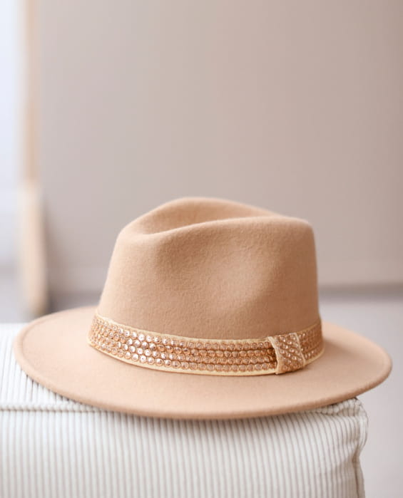 Pour apporter notre petite touche maradjique, notre chapeau en feutre Jim Beige est orné d'un galon brodé beige rosé.