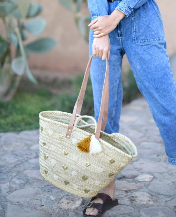 Intégralement en osier, il est fabriqué au Maroc, à Fès. Les cœurs brodés sur ce panier, ce sont les petites touches rendant cet accessoire intemporel féminin.
