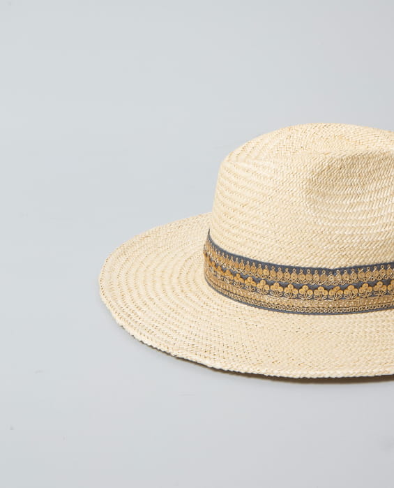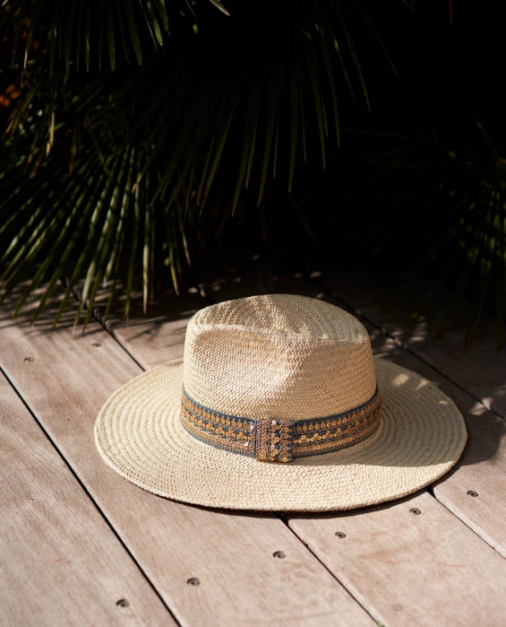 Un chapeau en paille à bords larges orné d'un galon brodé. Léger et glamour à la fois, il est l'accessoire parfait pour habiller vos tenues lors des cocktails nights estivales.