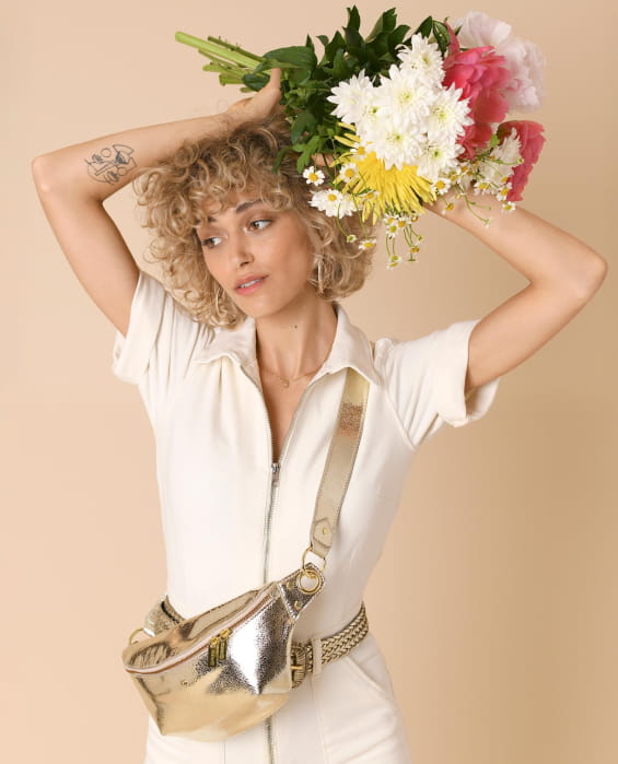 Nous avons amélioré le système d’attache de notre anse en ajoutant une boucle dorée. Non seulement le résultat est encore plus délicat et élégant, mais le cuir ne coince plus les anses. Un retombé parfait une fois votre banane passée en bandoulière !